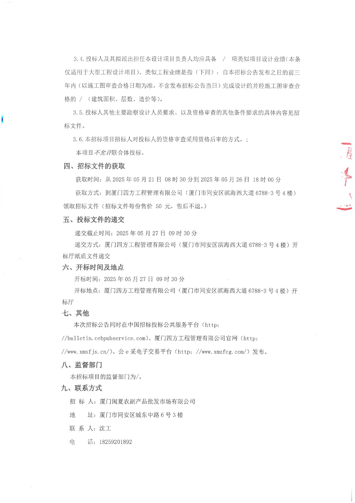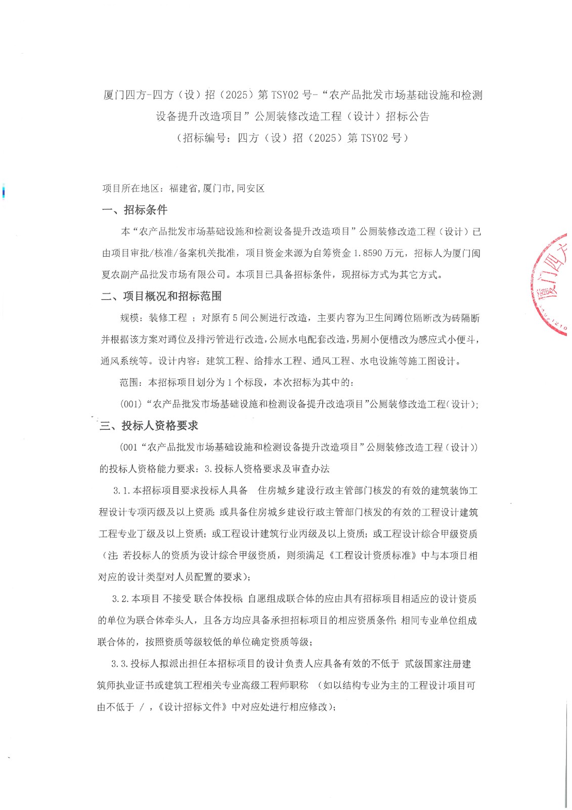 厦门四方-四方(设)招(2025)第TSY02号-“农产品批发市场基础设施和检测设备 提升改造项目”公厕装修改造工程(设计)招标公告